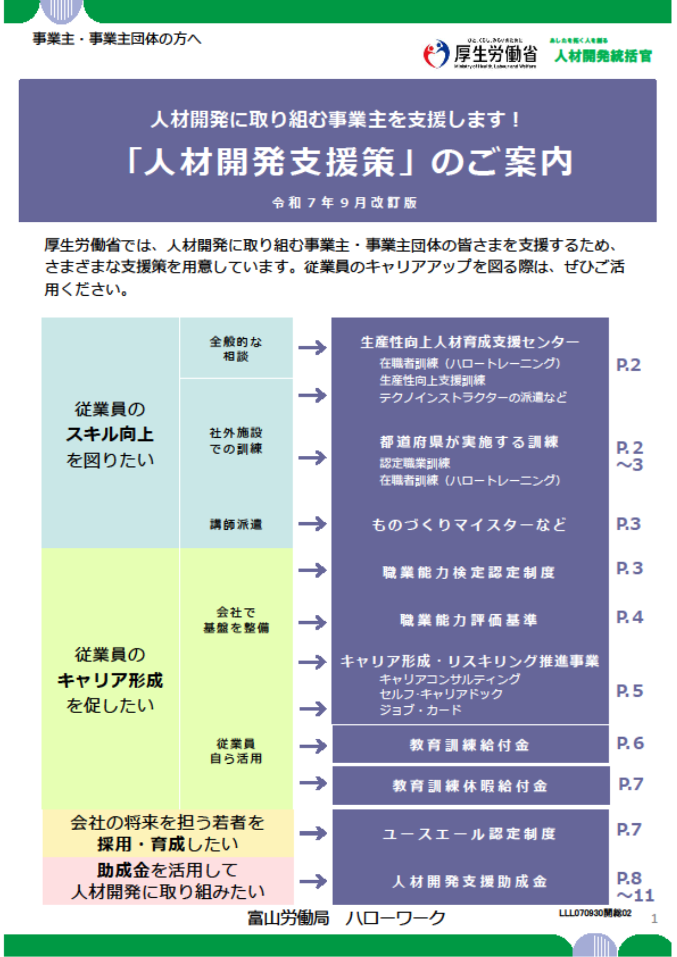 富山労働局では、企業における人材育成、労働生産性の向上につながる人材開発支援策【別紙1参照】について、月間中に経済団体や事業主に対して積極的な周知を行い、その活用促進を図ります。