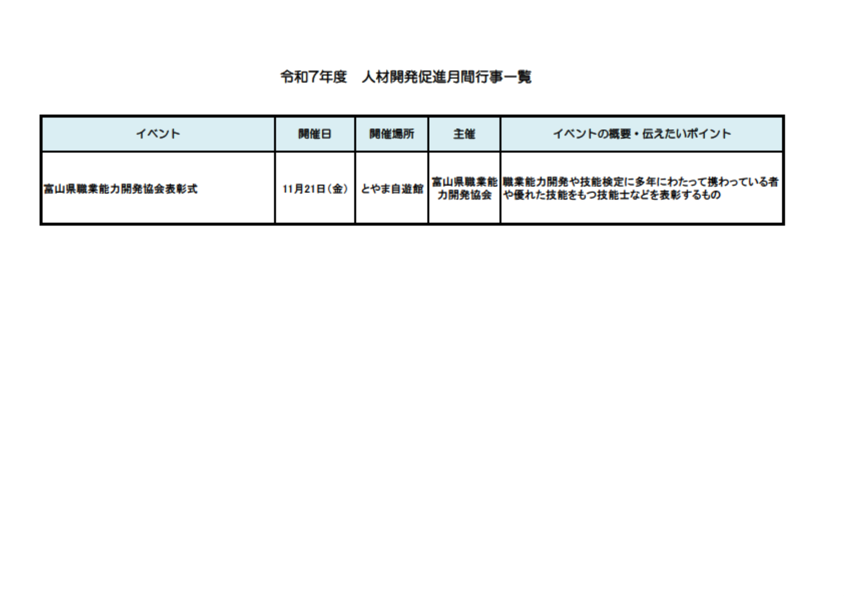 また、富山県において、優れた技能を持つ技能士や、質の高い教育訓練を実施している企業を表彰するなど、各種行事【別紙2参照】を開催し、生涯を通じた能力開発及び技能の振興の重要性について、労働者や事業主をはじめとする多くの方々の理解を深めます。