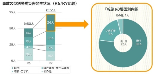 事故の型別では「転倒」と「はさまれ・巻き込まれ」の増加が顕著で、「転倒」では濡れた床面などでの「滑り」によるものが多発しています。
