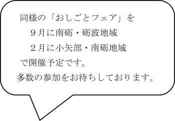 ハローワーク砺波では、離職者等の早期再就職を図るとともに、求人者に人材確保の場を提供することを目的に、管轄の自治体と連携し、求人者・求職者が一堂に会する「おしごとフェア」を開催します。