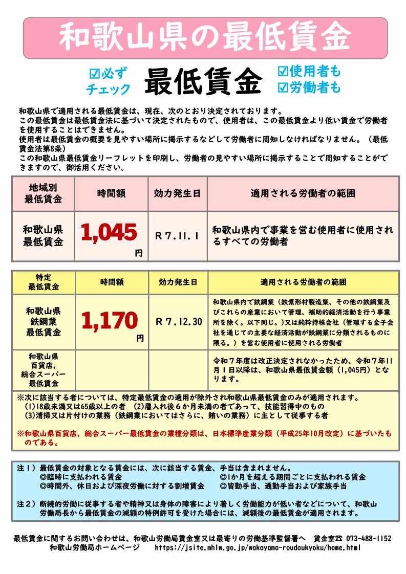 令和7年度は改正決定されなかったため、令和7年11月1日以降は、和歌山県最低賃金額(1,045円)となります。