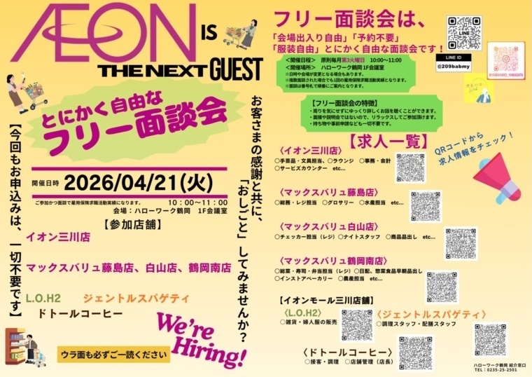 管内(鶴岡市・三川町)に就業場所があって、開催日に有効な求人のある事業所が対象となります。