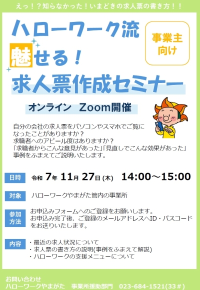 - 【事業主向け】ハローワーク流 魅せる!求人票作成セミナーのご案内