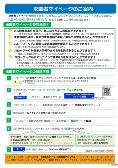 ハローワークインターネットサービス上に、「求職者マイページ」を開設すると、ご自宅のパソコンやタブレット、スマートフォンなどから、求人検索条件の保存などのサービスが利用でき、お仕事さがしがより便利になります。