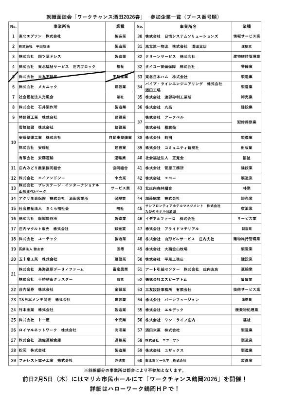 酒田市・庄内町・遊佐町の事業所60社が参加します。