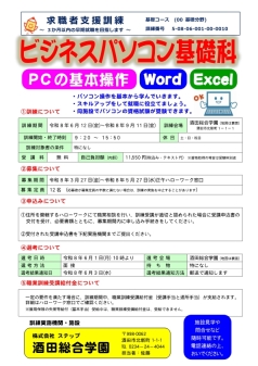 | ★ビジネスパソコン基礎科(酒田)【訓練期間:3ヶ月】 パソコン操作を基本から学んでいきます。スキルアップをして就職に役立てましょう。同施設でパソコンの資格試験が受験できます。 【募集期間】R8.3.27(金)~R8.5.27(水)正午ハローワーク窓口 【訓練期間】R8.6.12(金)~R8.9.11(金) ★パソコン基礎科(短時間)【訓練期間:2ヶ月】 職業能力の基礎となるコミュニケーション力やビジネスマナーを身につけ、事務用ソフトウェアを用いて基本的なビジネス文書等が作成できるよう学び、就職に結びつけます。 |