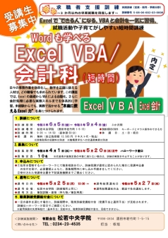 | ★OA実務科【訓練期間:3ヶ月】 MS Office表計算の基礎、VBAによるプログラミングの基礎から実践的な活用法、パソコン会計の基礎を習得します。MOS検定(MOS Excelエキスパート)、日商(PCデータ活用2級、電子会計実務検定試験3級)の資格取得、あなたの再就職をバックアップします。 ★OAシステム科【訓練期間:3ヶ月】 パソコンの基礎から活用法まで習得します。日商PC検定(文書作成3級、データ活用3級)の資格取得、あなたの再就職をバックアップします。 ★OA活用実践科【訓練期間:3ヶ月】 表計算の基礎から活用法(Excel、ExcelVBA)を習得します。MOS検定(MOS Excel エキスパート)の資格取得、あなたの再就職をバックアップします。 |