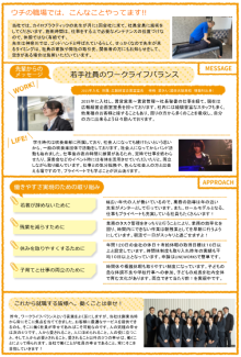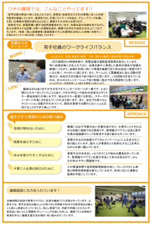 ユースエール認定企業は、前事業年度の正社員の月平均所定外労働時間が20時間以下。かつ、月平均の法定時間外労働60時間以上の正社員がゼロ。加えて、有給休暇の取得率も高いなど、のびのび働き、のびのび成長できる会社です。