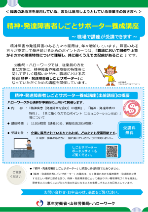 企業内において雇用される精神障害者が年々増加している中、就職後の定着率が低いことが課題となっています。そのような背景から、企業内において、精神・発達障害者を温かく見守り、支援する応援者となる「精神・発達障害者しごとサポーター」を養成し、職場内における精神・発達障害に対する正しい理解を促進することを目的とし、ハローワークでは精神・発達障害者しごとサポーター養成講座を開催しています。当該サポーターを増やしていくことにより、職場における障害者を支援する環境づくりを推進することにつながります。職場内での出前講座も可能です。