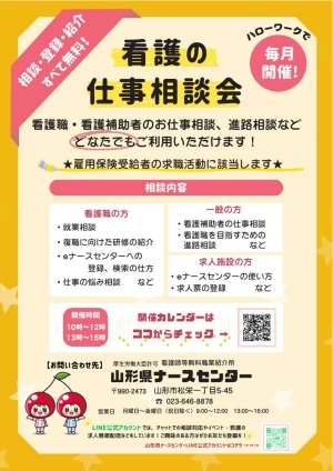 看護について山形県ナースセンターの専門員がハローワーク内で皆さんの相談に応じます。看護分野の仕事に関心のある方等どなたでもお気軽にご利用ください。