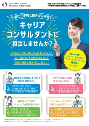 「キャリアコンサルティング」とは、働く人の職業選択、職業生活設計又は職業能力の開発及び向上に関する相談に応じ、支援を行うことをいいます。