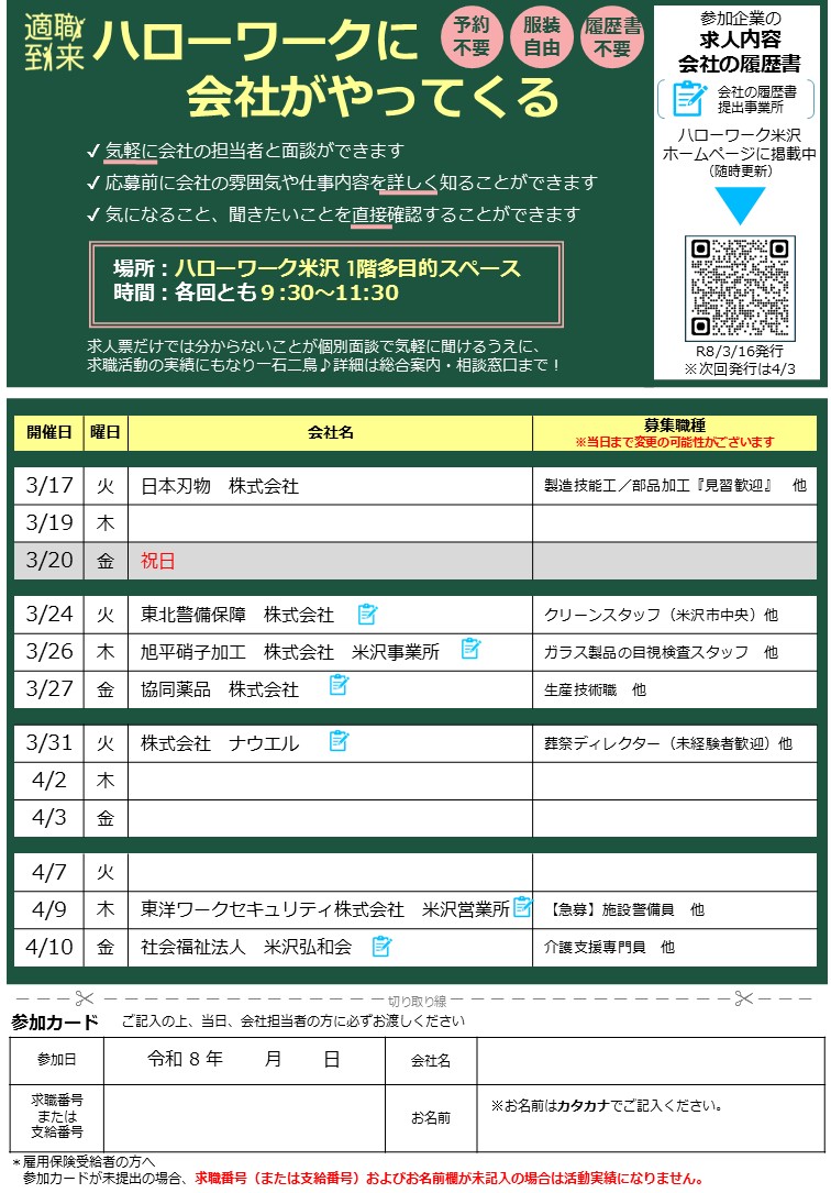 ご希望の事業所の方はハローワーク米沢求人担当(0238-22-8155)までお問合せください。