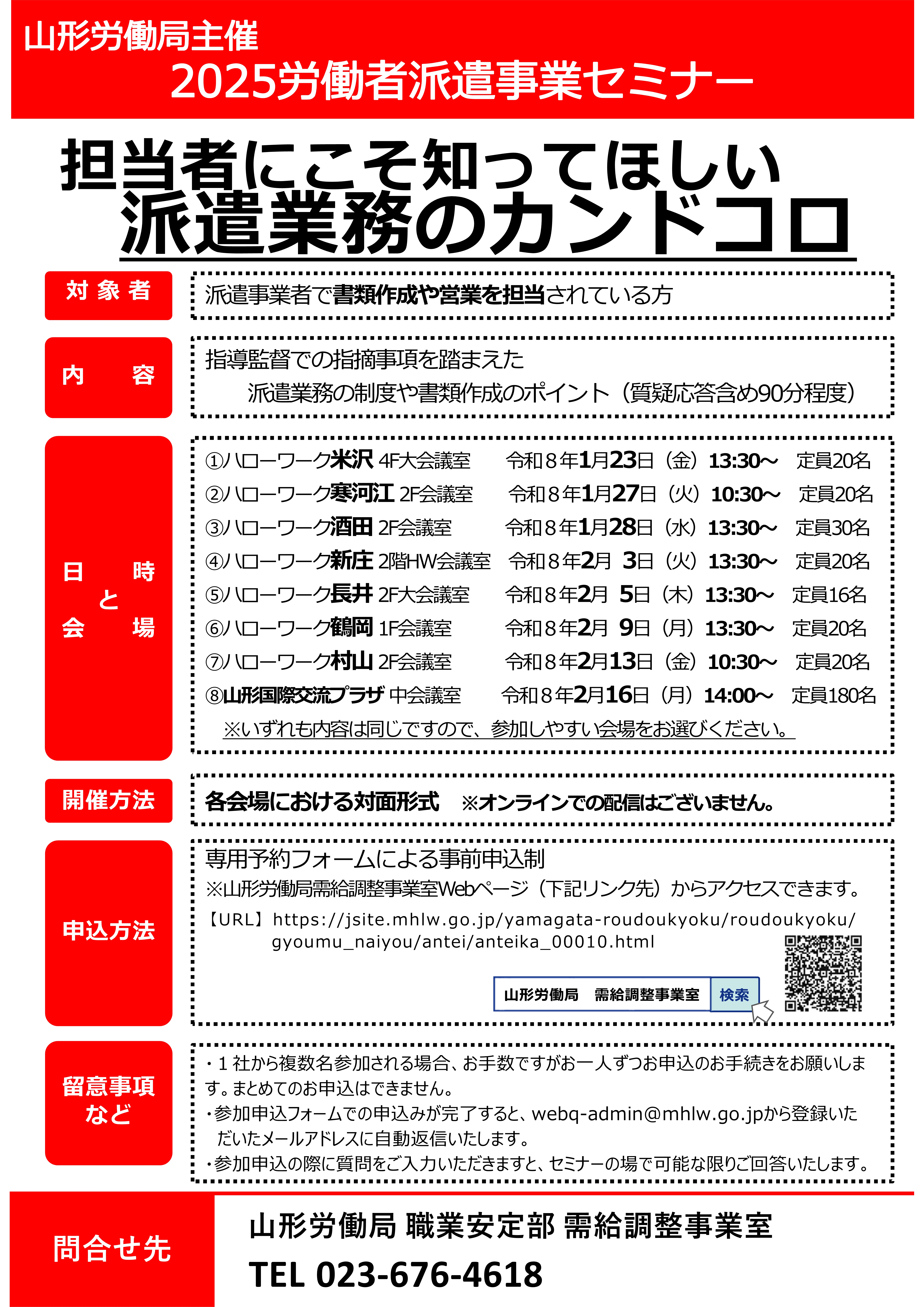 令和7年1月23日(金)から2月16日(月)にかけて、県内ハローワーク等を会場とした、労働者派遣事業セミナーを開催します。