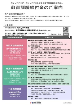 教育訓練給付金とは、働く方々の主体的な能力開発やキャリア形成を支援し、雇用の安定と就職の促進を図ることを目的として、厚生労働大臣が指定する教育訓練を修了した際に、教育訓練経費の一部が支給されるものです。