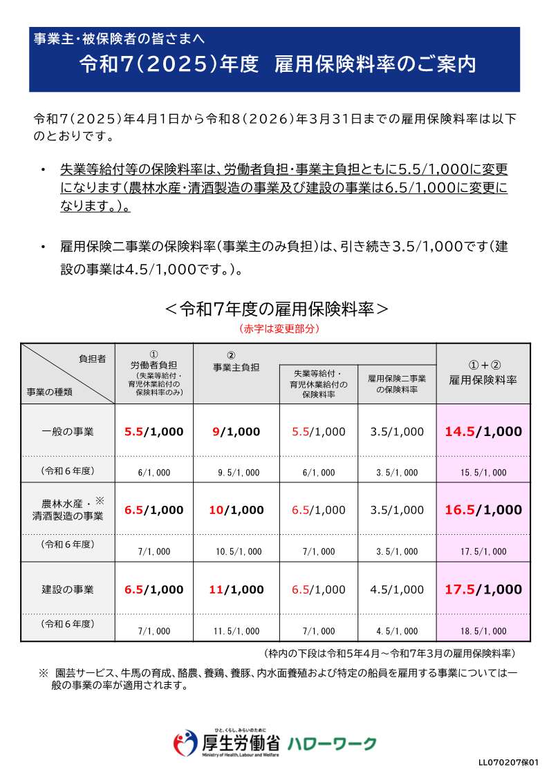 ●令和7年4月1日から令和8年3月31日までの雇用保険料率は以下のリーフレット(PDF)をご参照願います。