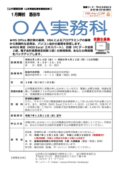 | ★OA実務科【訓練期間:3ヶ月】 MS Office表計算の基礎、VBAによるプログラミングの基礎から実践的な活用法、パソコン会計の基礎を習得します。MOS検定(MOS Excelエキスパート)、日商(PCデータ活用2級、電子会計実務検定試験3級)の資格取得、あなたの再就職をバックアップします。 【訓練期間】R8.1.14~R8.4.13 【募集期限】R7.12.11 正午 ハローワーク窓口 ★OA事務科【訓練期間:4ヶ月】 ※募集期間終了 パソコンの基礎から活用法、簿記の基礎知識を習得します。日商PC検定(文書作成3級、データ活用3級)、日商簿記検定3級の資格取得、あなたの再就職をバックアップします。 ★OA活用実践科【訓練期間:3ヶ月】 ※募集期間終了 表計算の基礎から活用法(Excel、ExcelVBA)を習得します。MOS検定(MOS Excel エキスパート)の資格取得、あなたの再就職をバックアップします。 |
