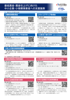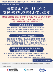 | 最低賃金・賃金引上げに向けた支援 最低賃金・賃金の引上げに向けて、関係省庁と協力し、中小企業・小規模事業者に対する生産性向上等の支援を行っています。最低賃金・賃金引上げに関する助成金などの支援施策については、次のとおりです。 |
