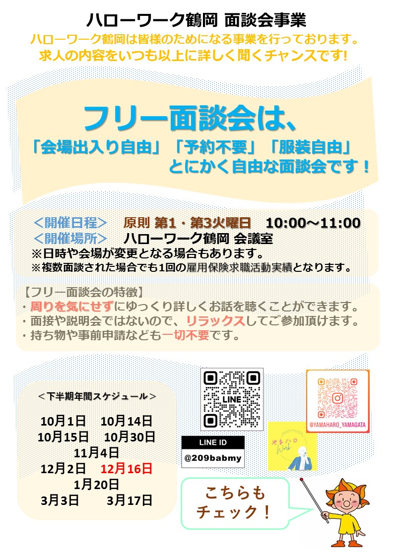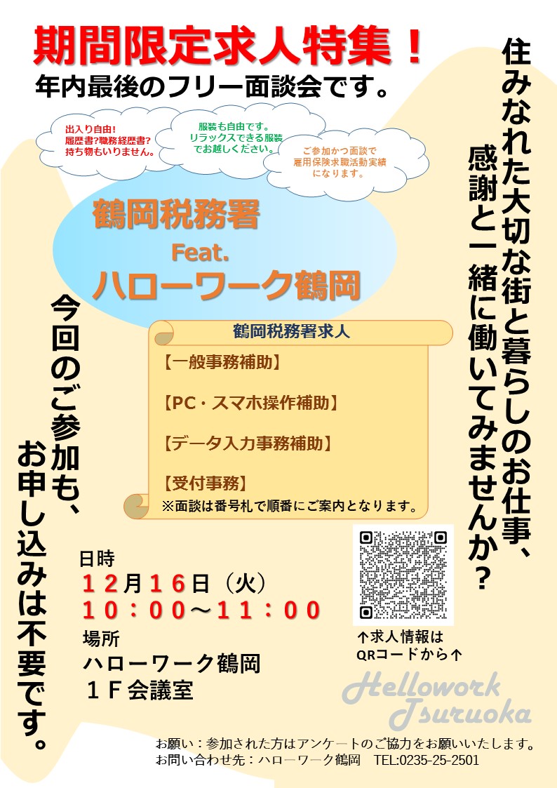 今回は12/16(火)10:00よりハローワーク鶴岡1F 会議室にて開催です。