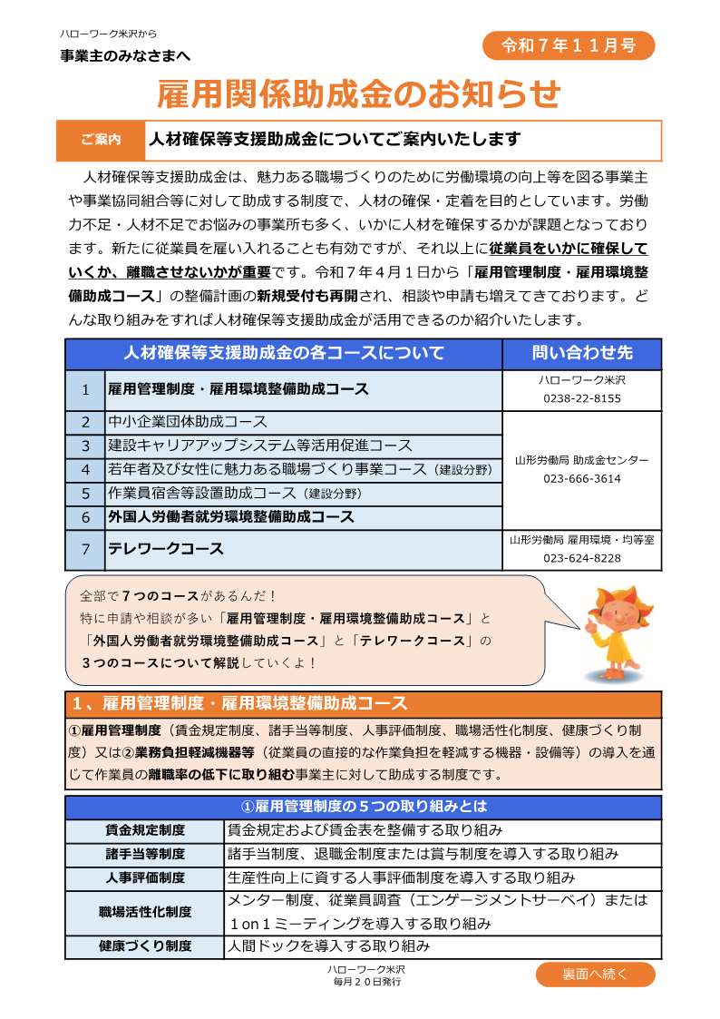 ●月刊誌「雇用関係助成金のお知らせ」(米沢所発行)について