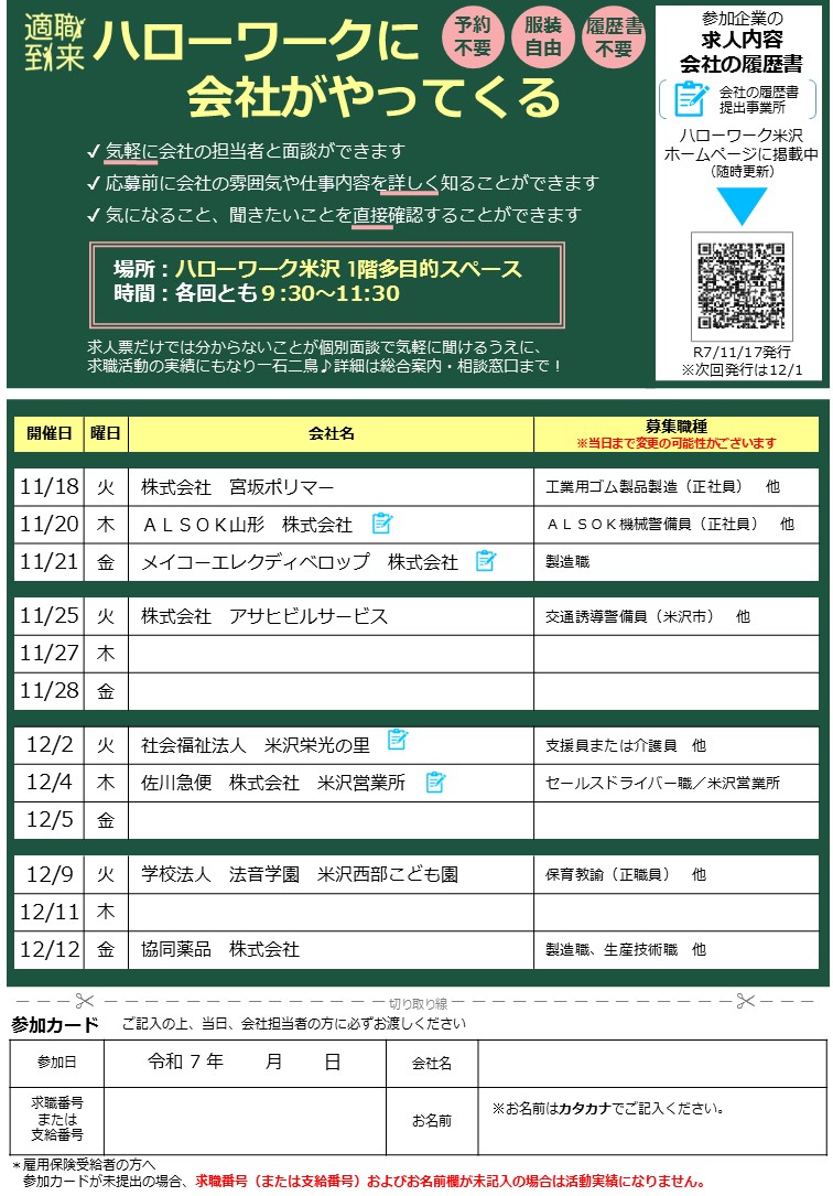 ご希望の事業所の方はハローワーク米沢求人担当(0238-22-8155)までお問合せください。