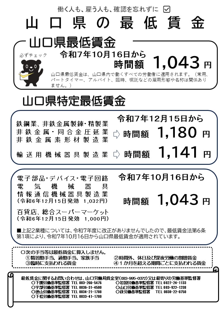 以下の特定最低賃金については、令和7年10月16日から山口県最低賃金時間額 1,043円が適用されています。