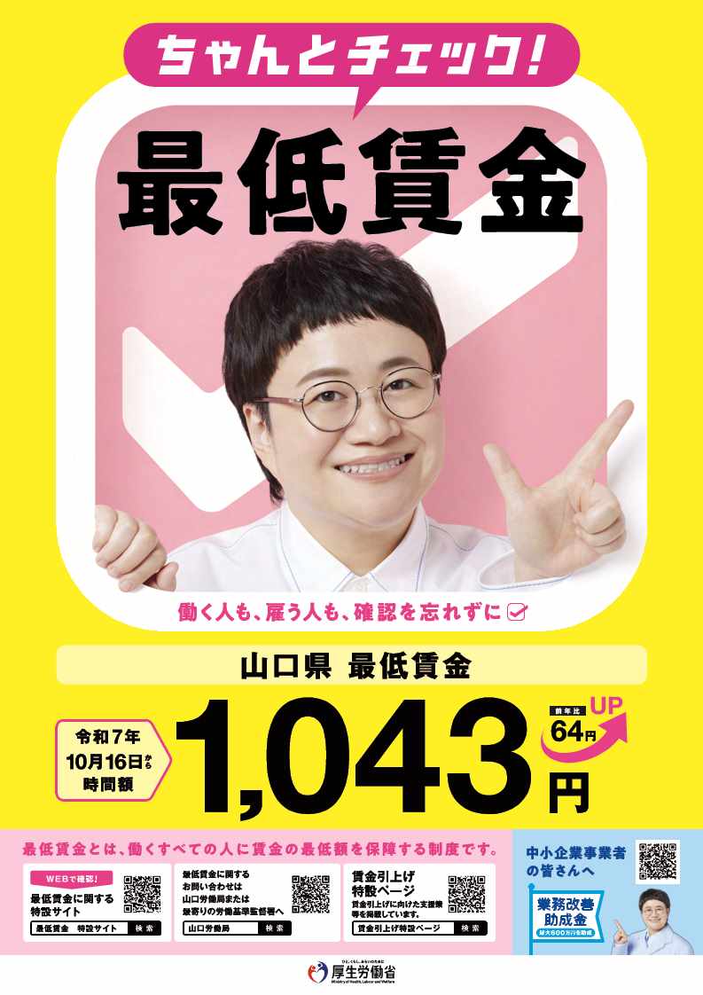 山口県最低賃金 時間額1,043円 令和7年10月16日発効