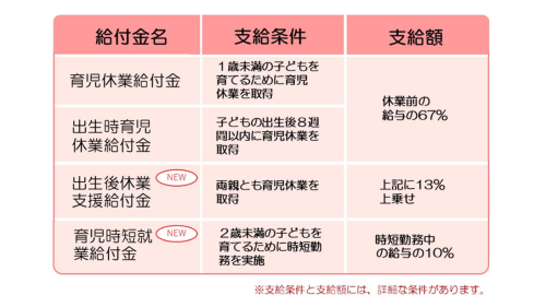 育児休業等給付として、子の年齢や養育の状況に応じて、要件を満たす場合に出生時育児休業給付金、育児休業給付金、出生後休業支援給付金、育児時短就業給付金が支給されます。
