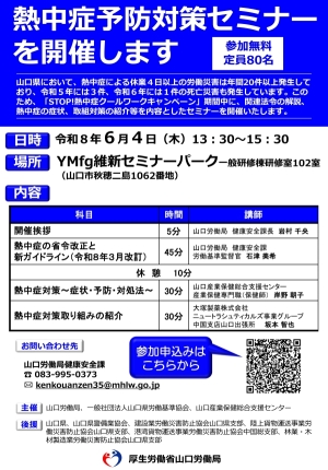 「STOP!熱中症クールワークキャンペーン」期間中に、熱中症予防対策セミナーを開催いたします。詳細は以下のリーフレットをご覧ください。