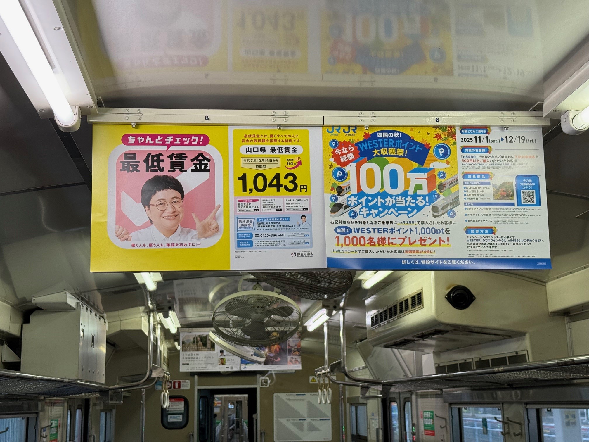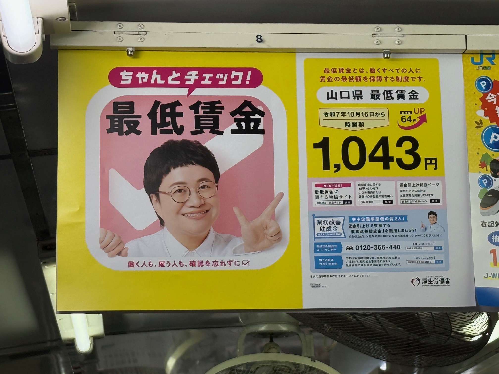 令和7年10月16日から山口県最低賃金(地域別最低賃金)が時間額1,043円に改正されたことを県民の皆様に広く知っていただくため、JR山口線などの車両内に山口県最低賃金周知用ポスターを掲示しました。