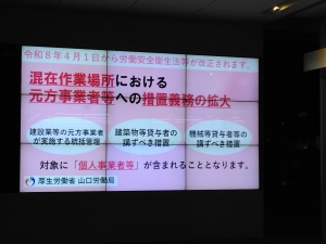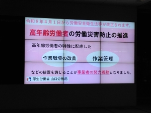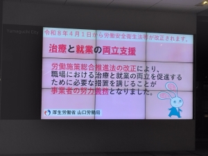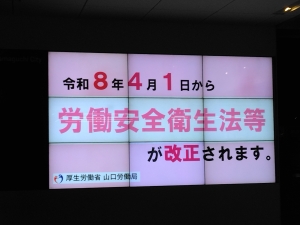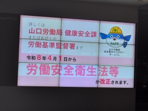 山口労働局では、新山口駅構内のデジタルサイネージにおいて、令和8年4月1日から施行される「改正労働安全衛生法」の周知動画を放映しています。