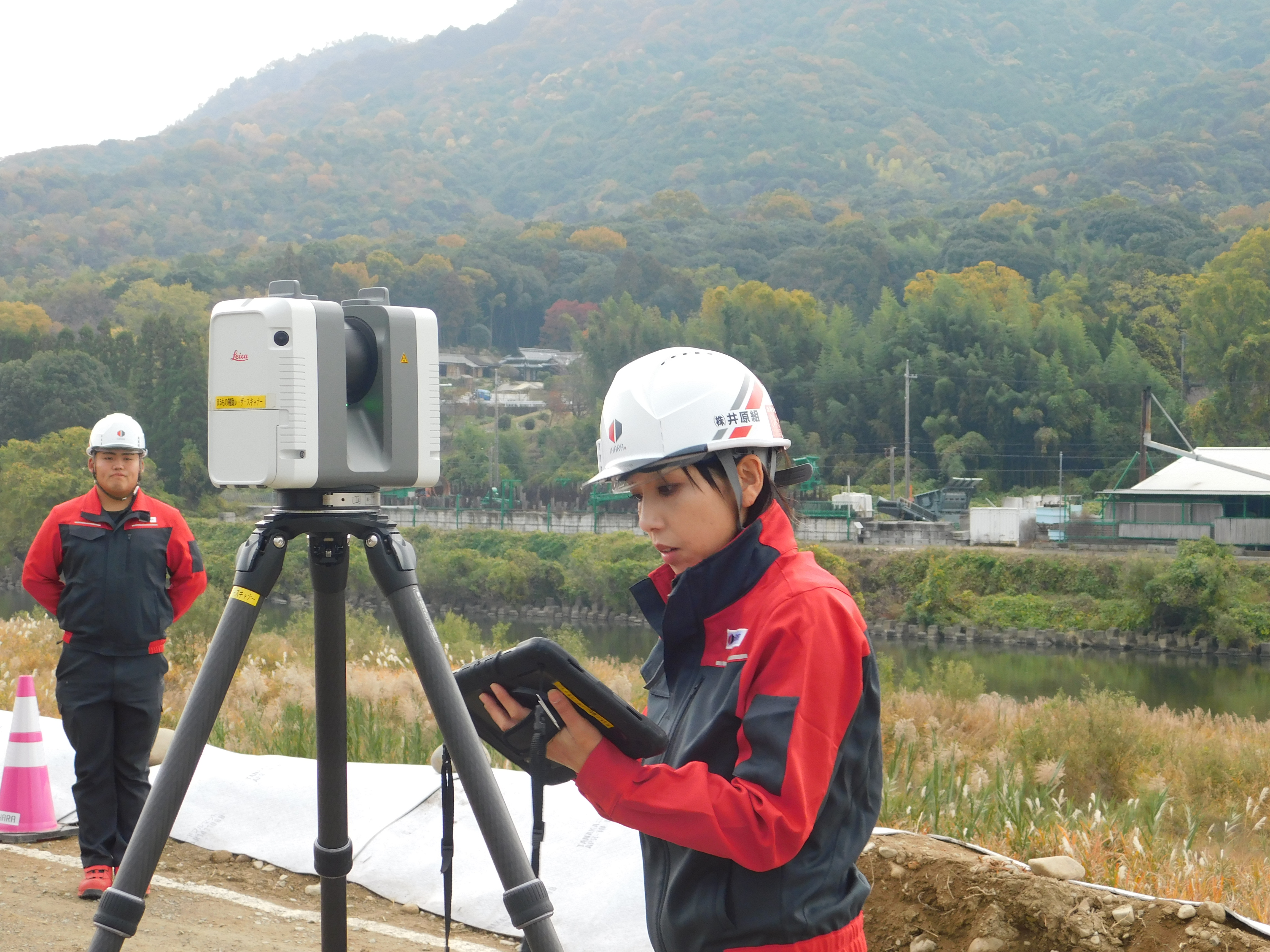 3Dレーザースキャナー(ICT機器)を使用して測量を行う様子の建設ディレクターの岡村愛香さん