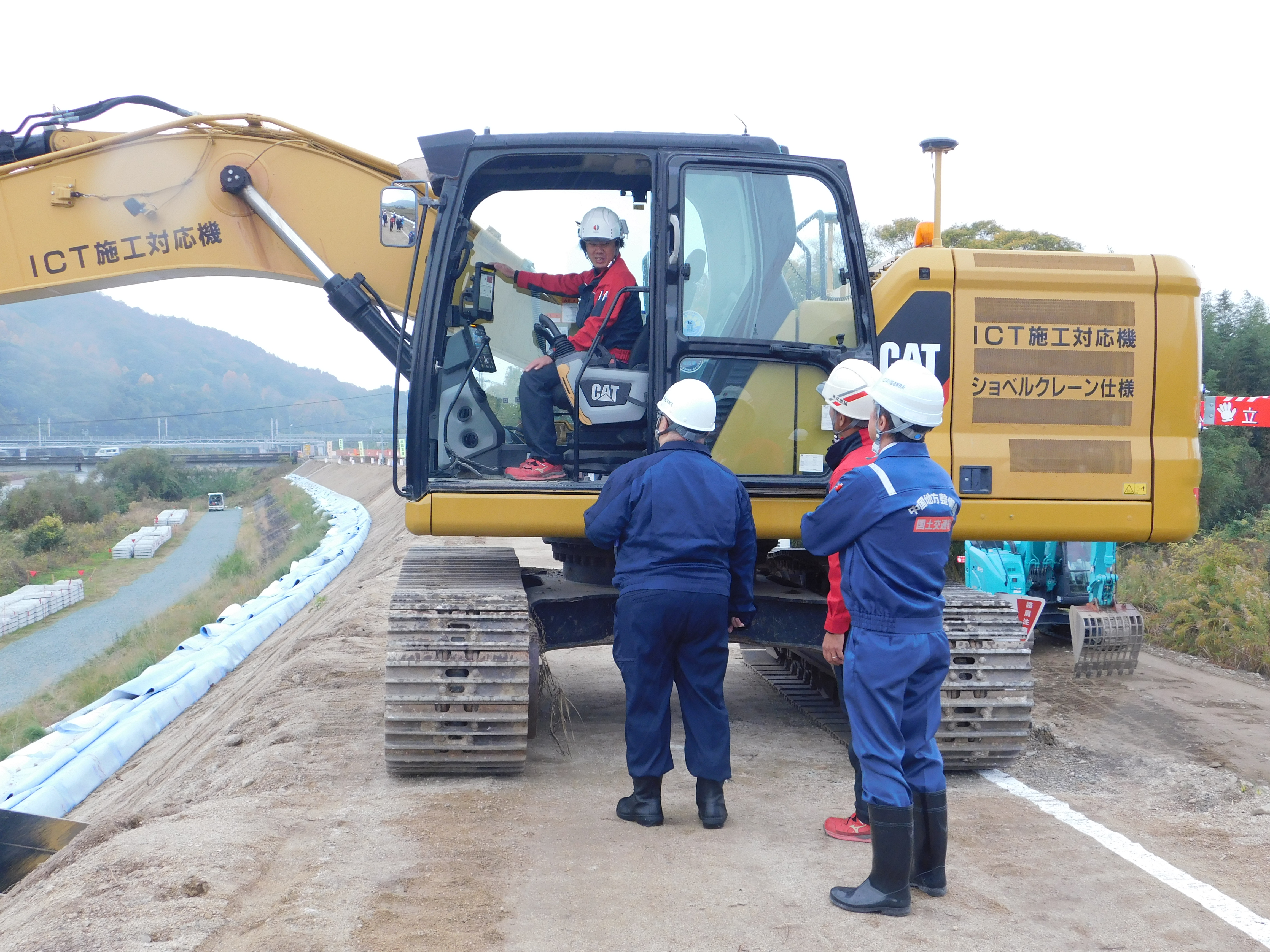 今回は、令和6年4月から時間外労働の上限規制が適用されたことに加えて、改正建設業法等の全面的施行を本年12月に迎える建設業において、完全週休二日制の採用とともに、建設ディレクター制度の導入、ICT技術の活用等により労働生産性の向上を図り、女性活躍にも取り組んでいる株式会社井原組と意見交換を行い、工事現場での取組状況も視察しました。なお、当該工事現場の発注者である国土交通省中国地方整備局山口河川国道事務所所長にも同席いただきました。