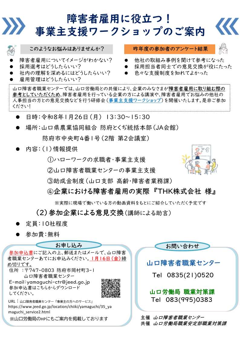 山口労働局では、企業のみなさまが障害者雇用に取り組む際の参考としていただくため、山口障害者職業センターが開催する研修会(事業主支援ワークショップ)を共催いたします。