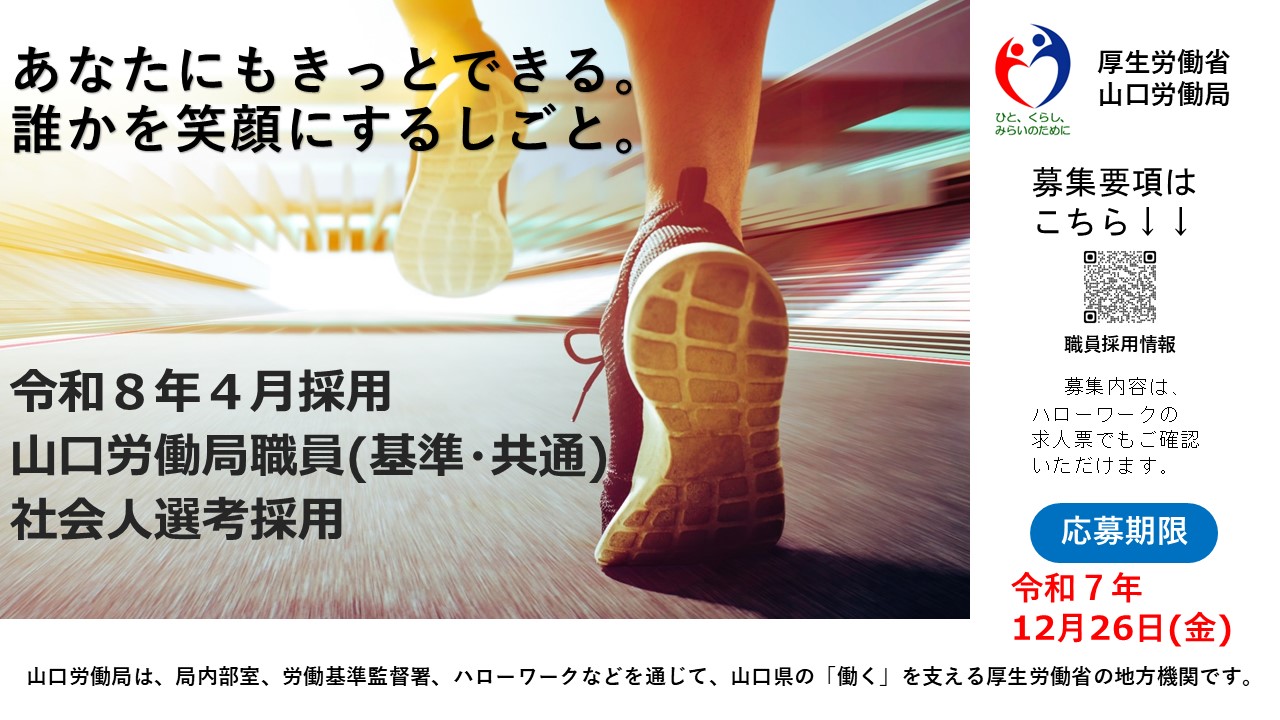 山口労働局では、令和8年4月1日採用予定の常勤職員について、民間企業等での業務経験を有する方を対象に、社会人選考採用を実施します。