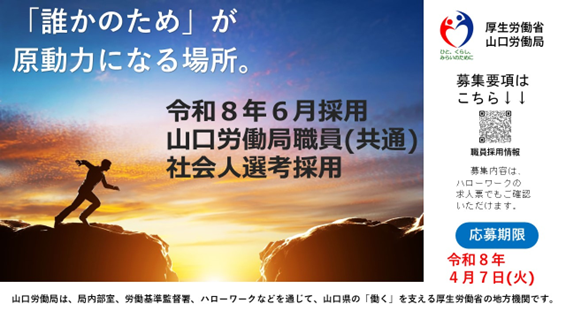 山口労働局では、令和8年6月1日採用予定の常勤職員について、民間企業等での業務経験を有する方を対象に、社会人選考採用を実施します。