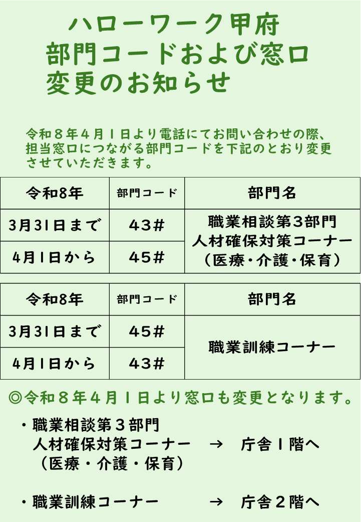 - 【ハローワーク甲府】部門コードおよび窓口変更のお知らせ(令和8年4月~)
