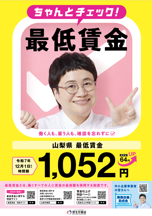 山梨県最低賃金 | 1,052円 | 令和7(2025)年12月1日 | 山梨県内で働くすべての労働者及び使用者に適用されます。 パート、アルバイト、臨時、嘱託などの雇用形態の別なく適用されます。 |