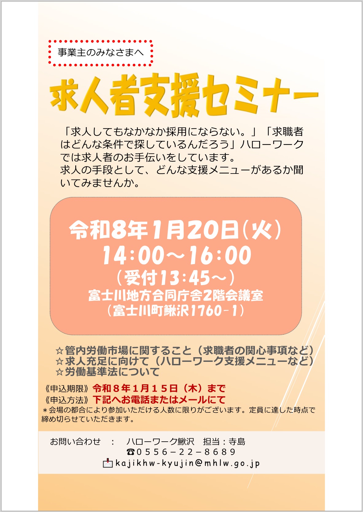 | ● | 「求人者支援セミナー」令和8年1月20日開催申込のご案内New | |