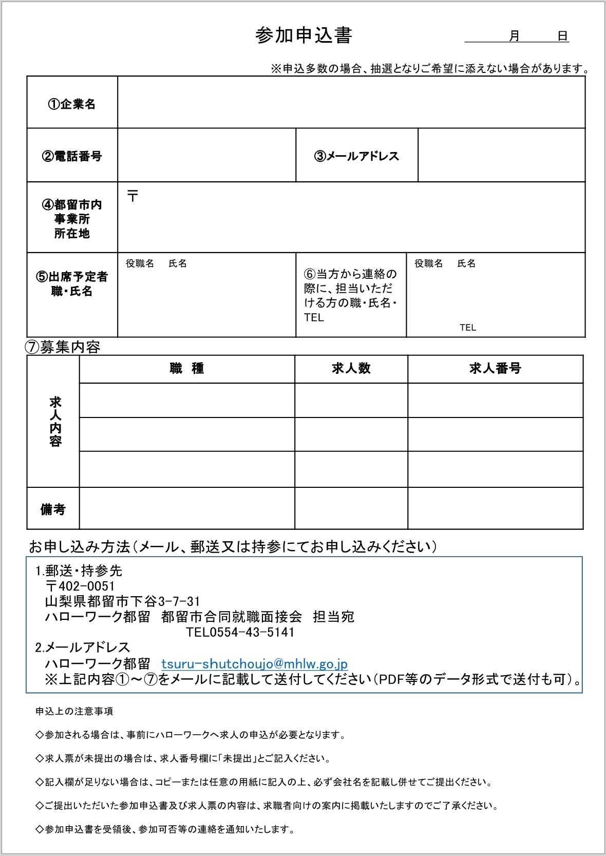 下記掲載の「参加申込書」をハローワーク都留へメール、郵送又は持参にてお申し込みください。