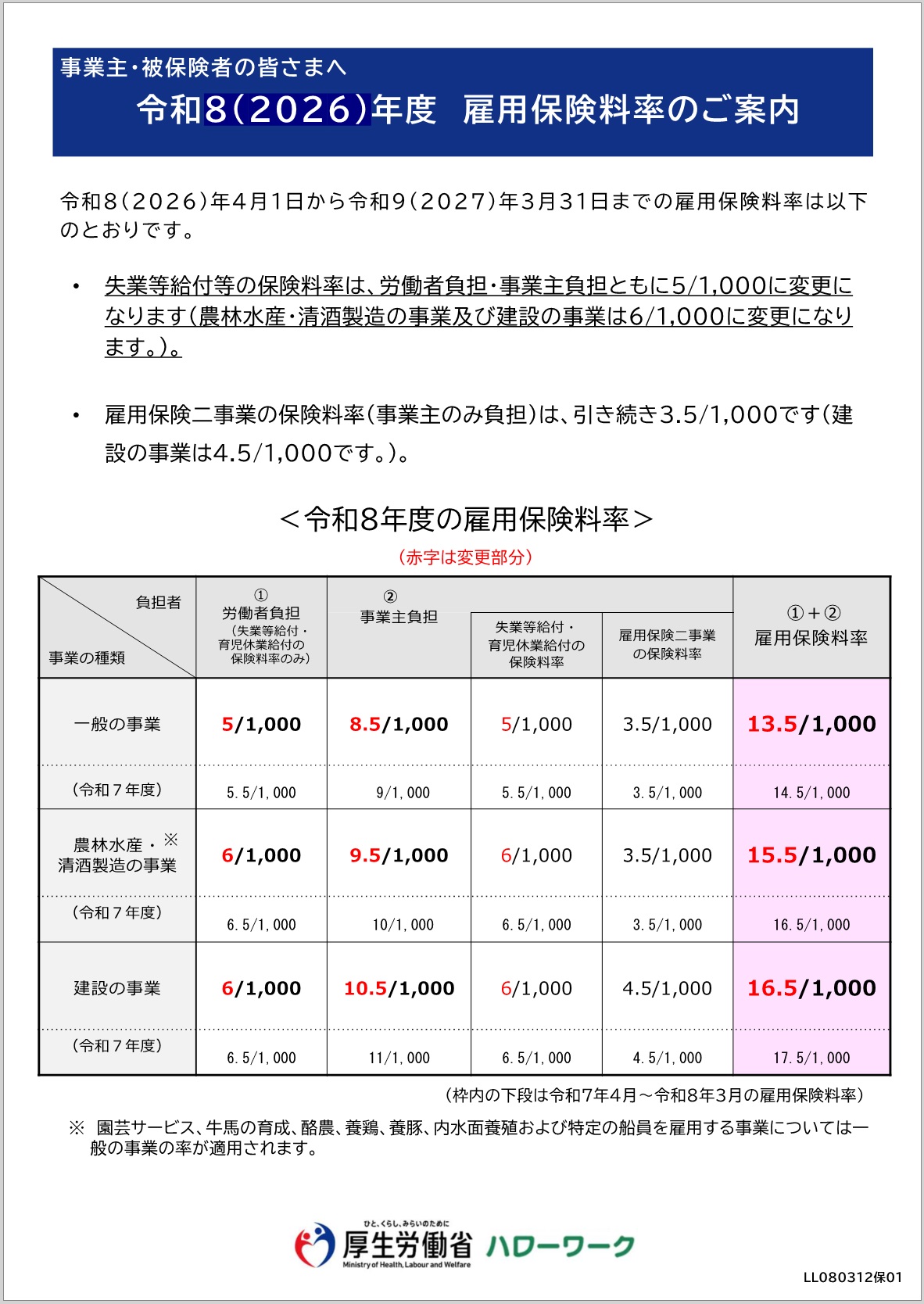 事業主・被保険者の皆さまへ 令和8(2026)年度 雇用保険料率のご案内