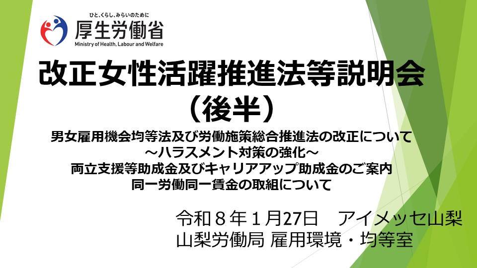 山梨労働局では、上記法令の改正ポイントを中心にご案内する説明会を令和8年1月27日に開催いたしました。その際の動画及び説明資料を以下に掲載しましたので、ぜひご覧ください。